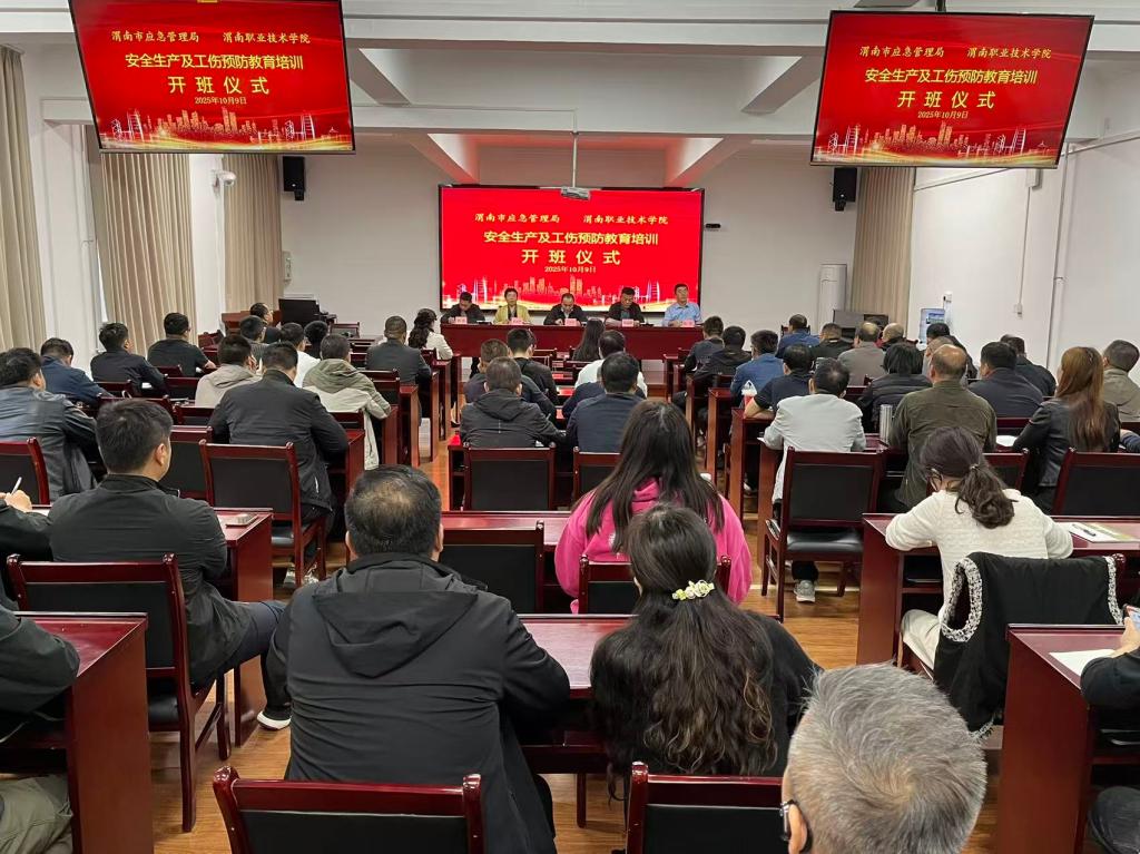 10月9日,由渭南市应急管理局主办、我校承办的渭南市工贸行业安全生产及工伤预防教育培训在朝阳校区正式开班。党委委员、总会计师吴运胜,市应急管理局党委委员、副局长冯党军,工矿商贸科科长陈辉,以及来自全市工贸行业的90余名安全管理人员共同出席。继续教育学院院长惠斌贤主持开班仪式。