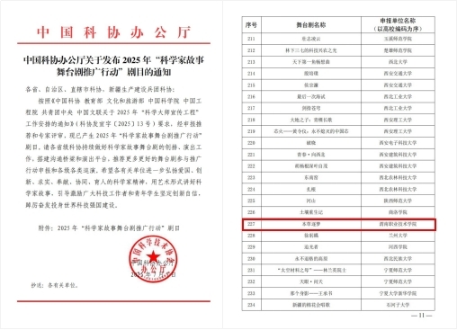 在中国科协公布的2025年“科学家故事舞台剧推广行动”剧目名单中,我校科协推荐的舞蹈诗《本草逐梦》成功入选,是陕西省唯一一所职业院校获批的剧目,也是我校首次获批由中国科协获批资助的项目。