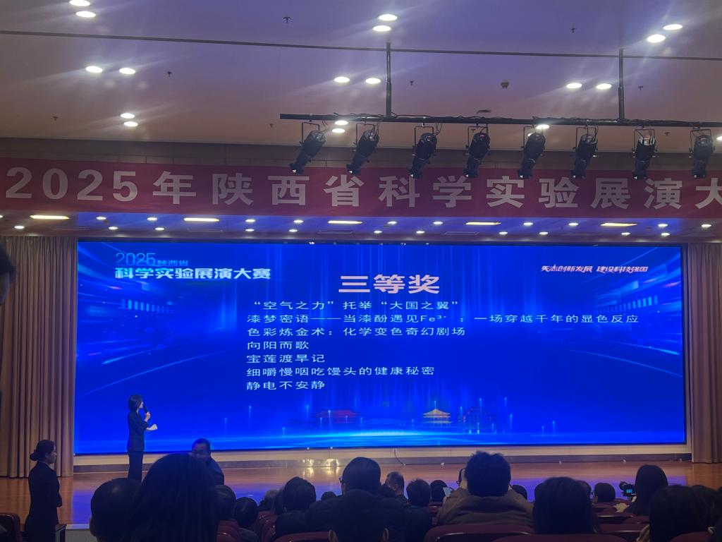 11月20日,由陕西省科学技术厅、陕西省教育厅、陕西省科学技术协会联合主办的2025年陕西省科学实验展演大赛圆满落幕。我校由白璐领队、杨文华指导,刘晓丹、张兴华、赵子龙组成的教师团队,凭借作品《宝莲渡旱记》从全省百余项参赛作品中脱颖而出,最终斩获三等奖。