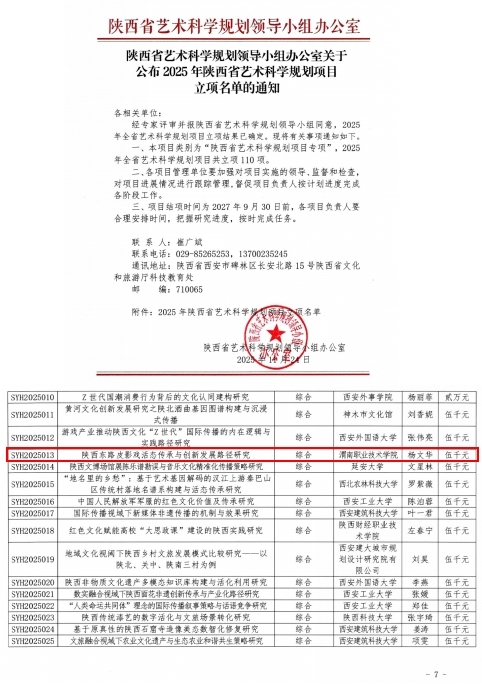 近日,陕西省文化和旅游厅公布2025 年度陕西省艺术科学规划项目立项名单,我校杨文华副教授主持申报的“陕西东路皮影戏活态传承与创新发展路径”项目成功获批。这是我校在非遗保护与艺术科学研究领域的又一重要突破,标志着学校在传统文化传承创新研究方面的学术实力获得省级权威认可。